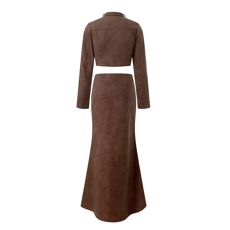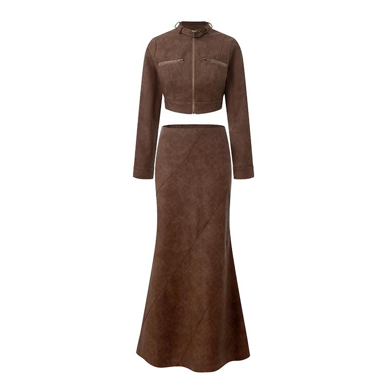 New Design Solid Two Piece Set Crew-Neck Women's Casual Long-Sleeve Vintage Two Piece Long Set Womens Summer Zipper Skirts Sets